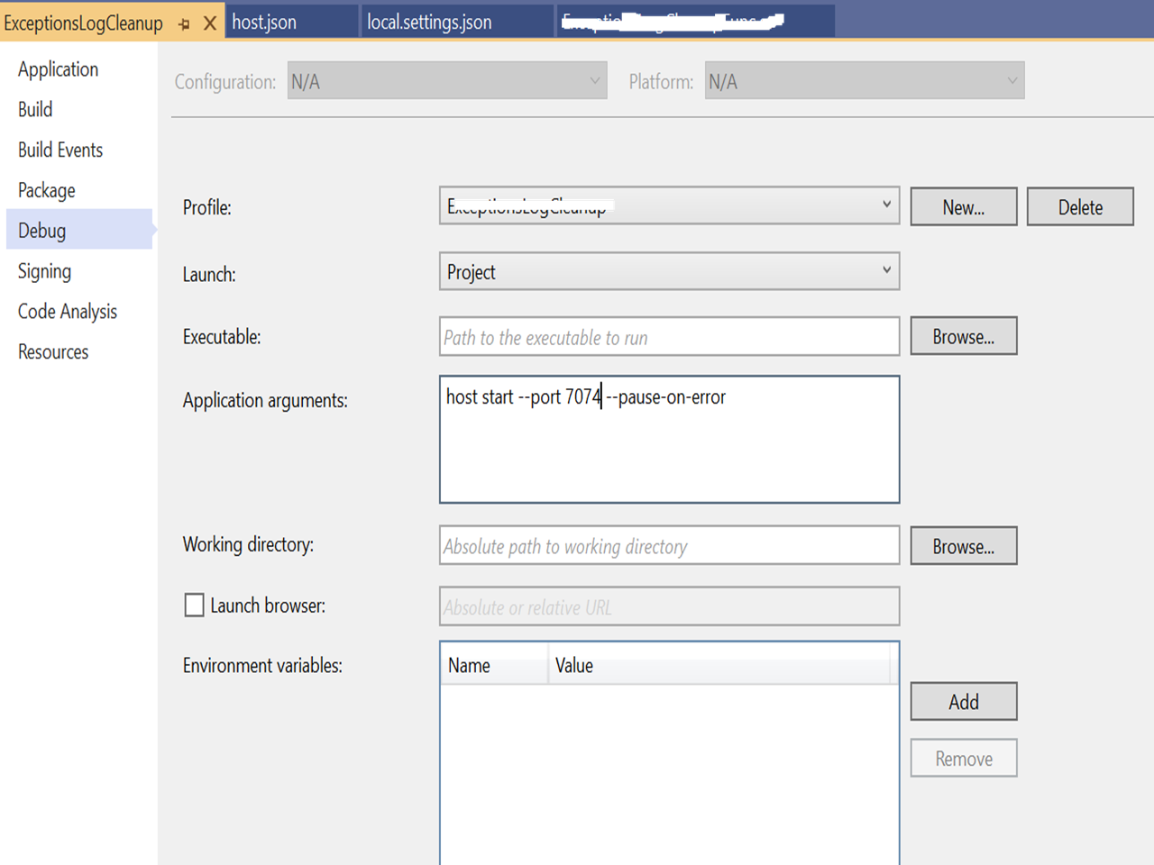 4. Update the Application Arguments with host start –port 7074 –pause-on-error